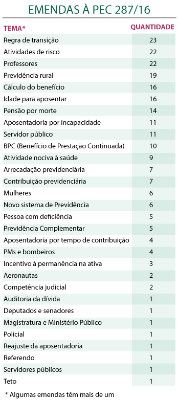 No total, foram apresentadas 164 emendas, das quais 34 não conseguiram o número regimental suficiente de assinaturas para continuarem tramitando, o que deixa um total 130 de emendas válidas para serem analisadas pelos deputados integrantes da Comissão Especial da Reforma da Previdência.
