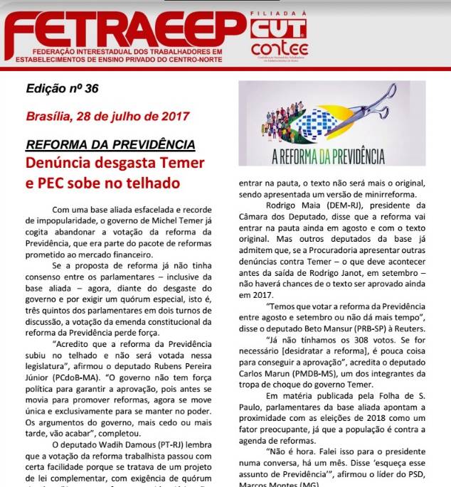 Informativo de nº 36 da Federação Interestadual dos Trabalhadores em Estabelecimento de Ensino Privado do Centro-Norte (Fetraeep), entidade a qual o alescomb_sinpro é filiada.