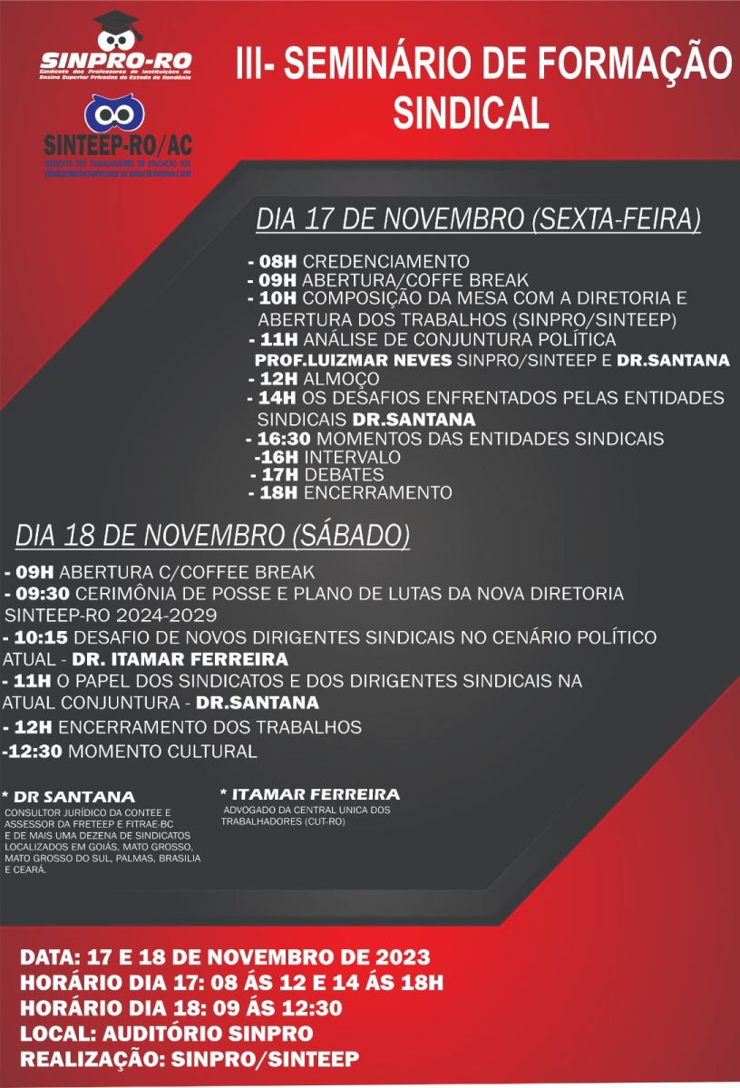 Começou nesta sexta-feira (17) a terceira edição do Seminário de Formação Sindical promovido pelo SINPRO-RO e SINTEEP RO/AC. O primeiro dia de evento contou com uma palestra sobre a análise da conjuntura política que aconteceu pela manhã.Na parte da tarde o destaque é a palestra sobre os desafios enfrentados por entidades sindicais, além do uso da fala das entidades e dos debates em torno dos temas do dia. O encerramento do primeiro dia está previsto para às 18h.
